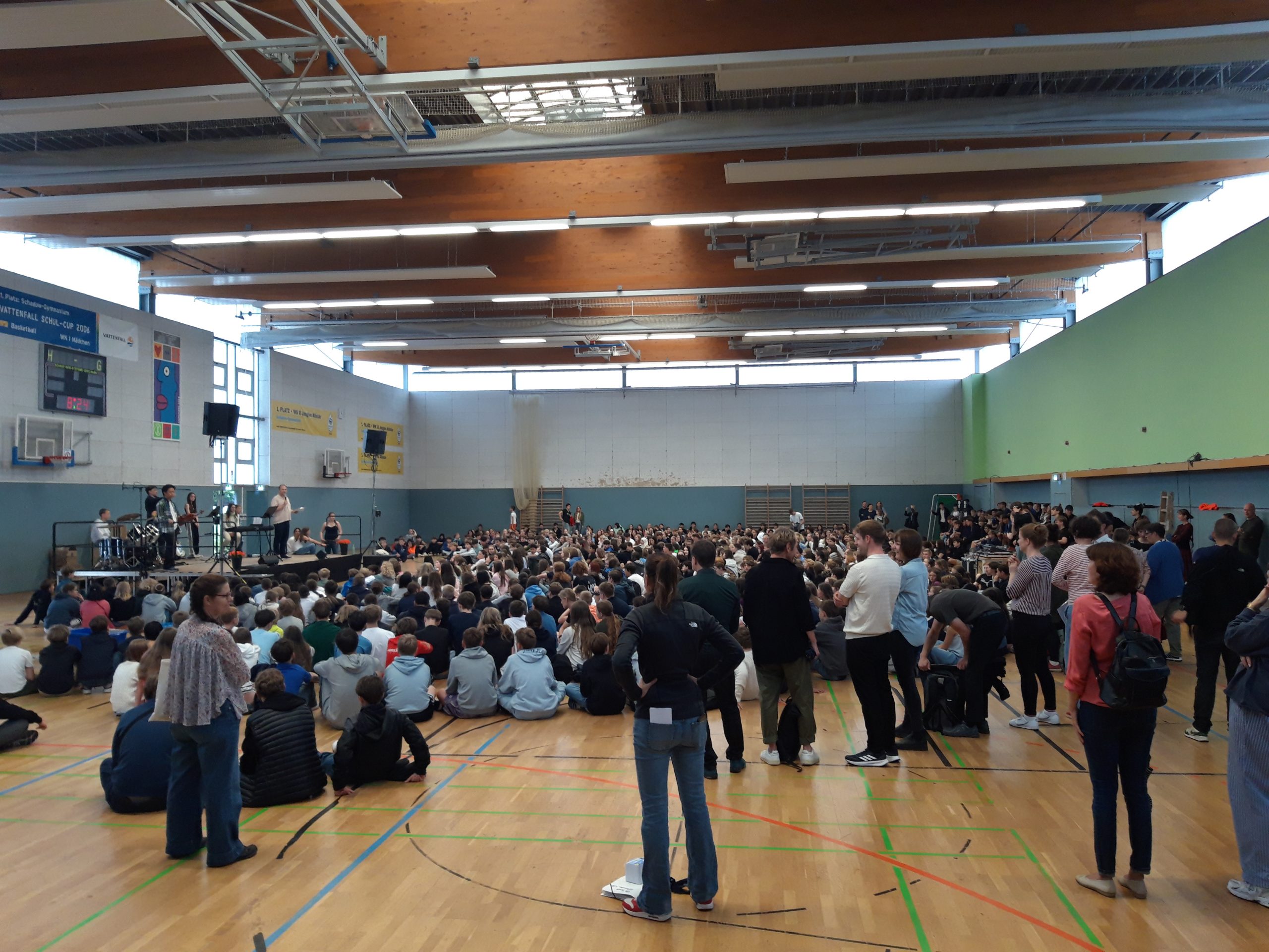 Hier sieht man die Sporthalle am letzten Schultag, während die Schulband auftritt. Immer schön die, Schule vereint zu sehen bei solchen Veranstaltungen. Auch wenn es manchmal ziemlich voll und eng war.
