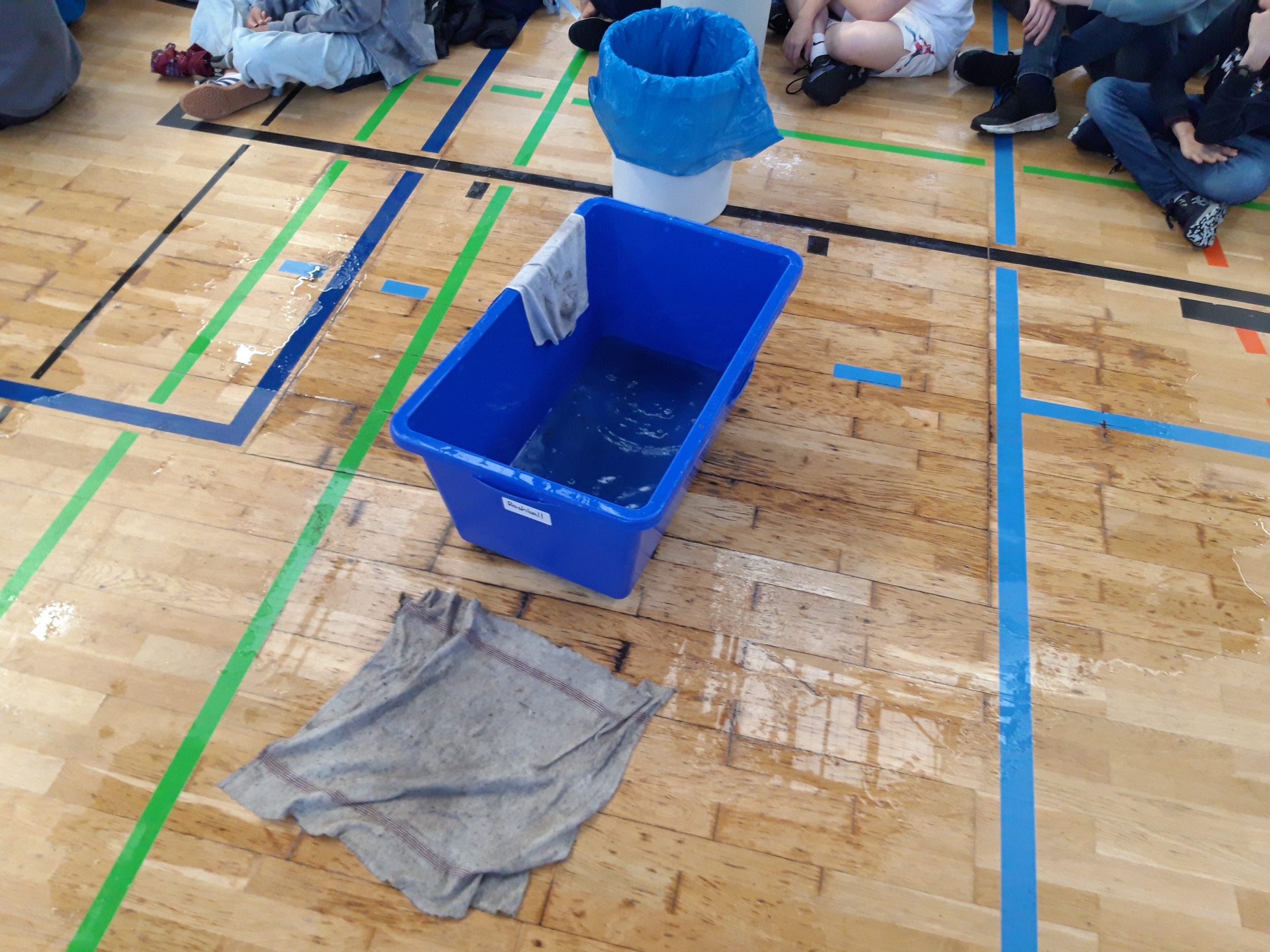 Hier sieht die renovationsbedüftige Seite der Sporthalle. Es hat leider öfter mal getropft, wie man sieht. Einer der Gründe, warum wir sie vermissen werden. Dieses Tropfen von der Decke war ikonisch für unsere Sporthalle.