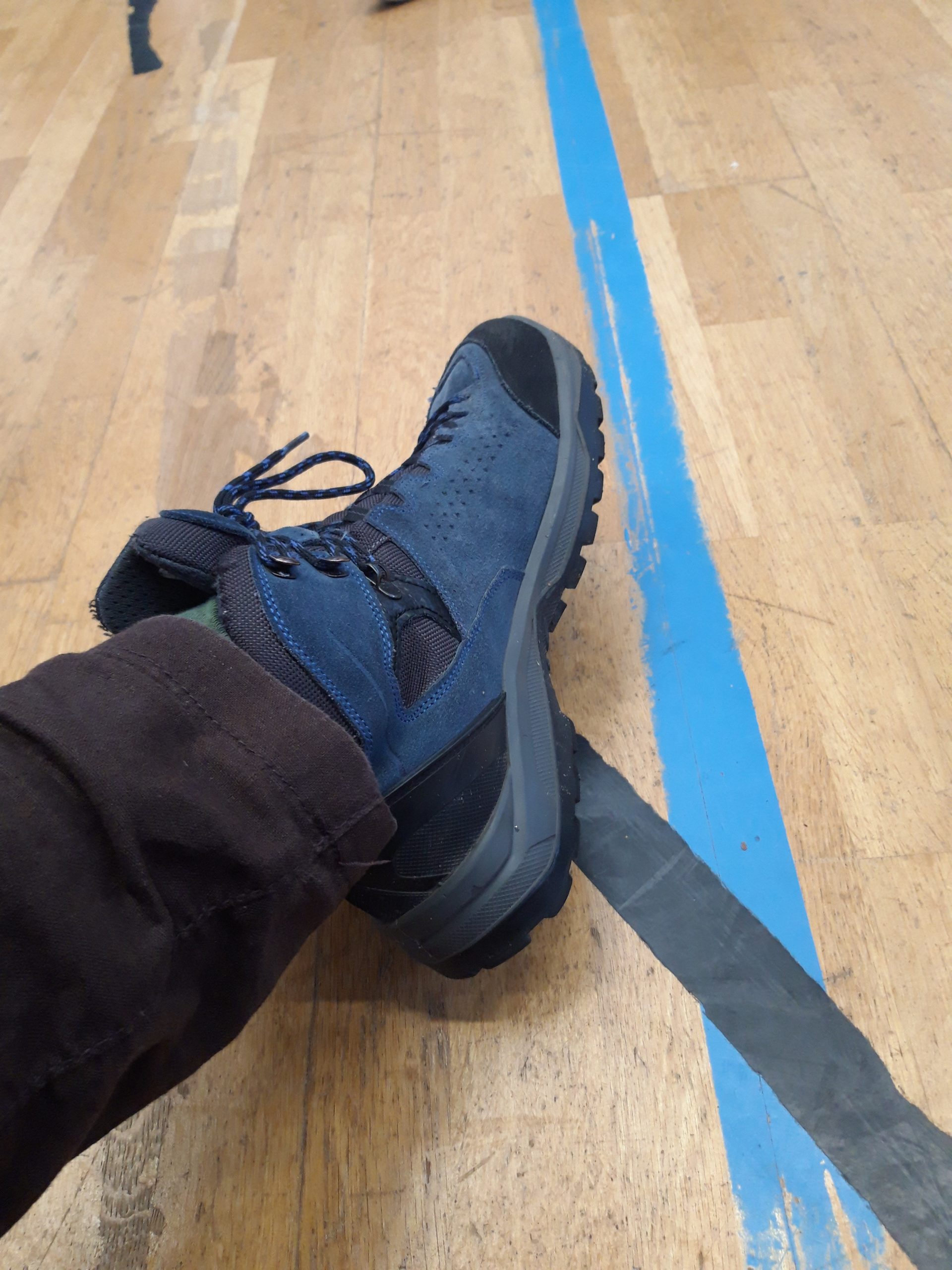 Schuhe durfte man eigentlich nie tragen in der Sporthalle. Die Lehrer haben immer einen Anfall bekommen, wenn man mit Schuhen in die Halle gegangen ist. Herr Schüz hat hier die Chance genutzt und hat seine wunderhübschen Schuhe am letzten Tag in der Halle noch getragen.