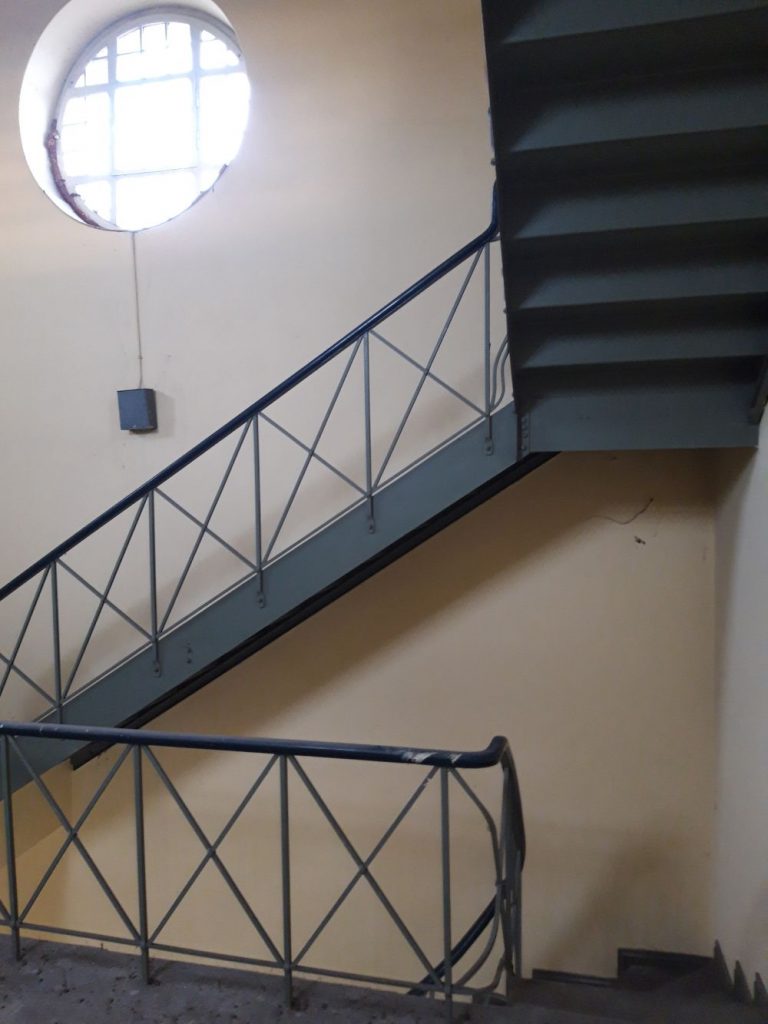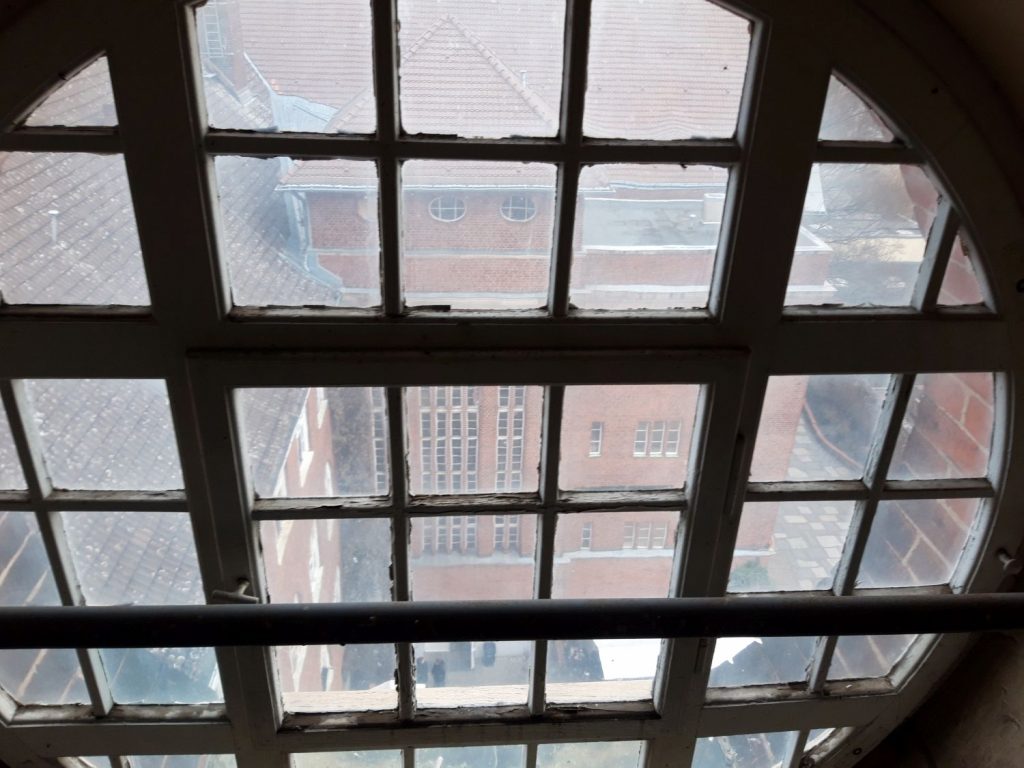 Hier ein Blick aus einem der runden Fenster auf das zweite Treppenhaus in Haus A, mittlerweile befindet man sich über dem das eigentlichen Dach der Schule: