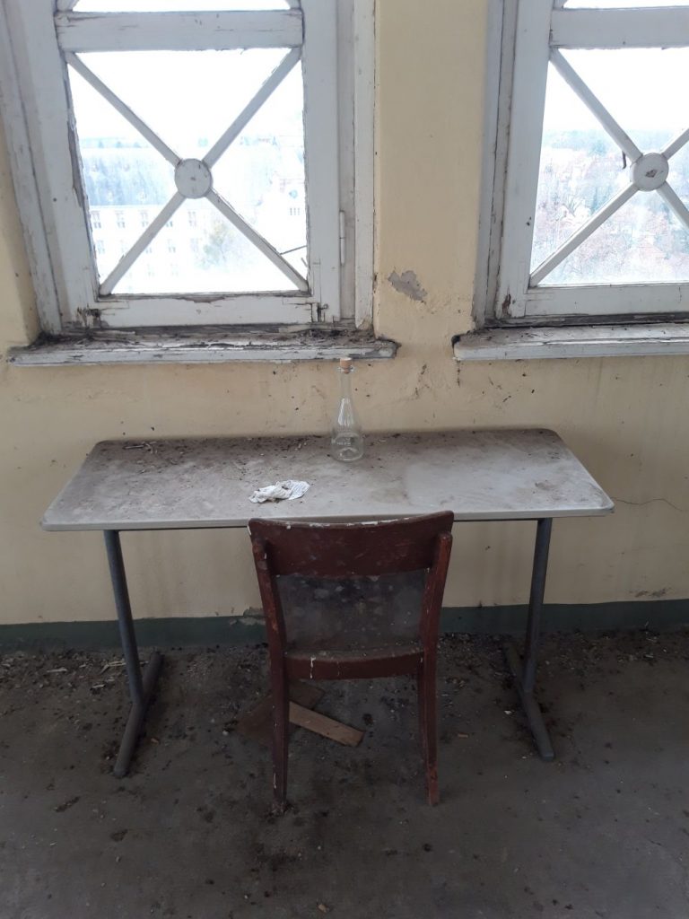 Hier befindet sich eigentlich ebenfalls nichts, außer einem seltsamen Schultisch mit Stuhl. Es stellt sich die Frage, warum eigentlich? War das der alte Raum zum Nachsitzen und Verfassen von Strafarbeiten? Haben hier die Lehrkräfte in Ruhe ihre Klassenarbeiten korrigiert? Und wer hat diesen Tisch die Treppen hochgeschleppt?
