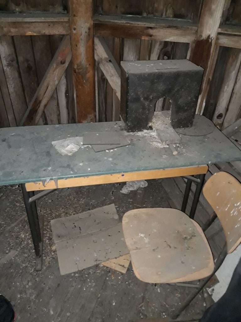 Zumindest das Ding auf dem Tisch kann mit den Turmfalken zu tun haben, die wohnen hier nämlich. Das Ding könnte einmal ein Teil dieses Kastens gewesen sein.