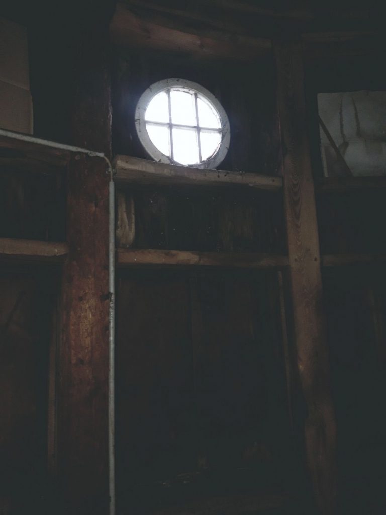 Oben auf den nächsten beiden Bildern sind die runden Fenster zu erkennen, sowie die Treppe und der Fußboden des Zwischenstockwerks. Das seltsame Kästchen an der Schnur ist in Wirklichkeit ein Ablauf für das Kondenswasser an den Scheiben, damit der Fensterrahmen und die Wand nicht nass werden: Das Wasser fließt durch eine Röhre in den Behälter, da verdunstet es, und kondensiert bei nächster Gelegenheit wieder oben.
