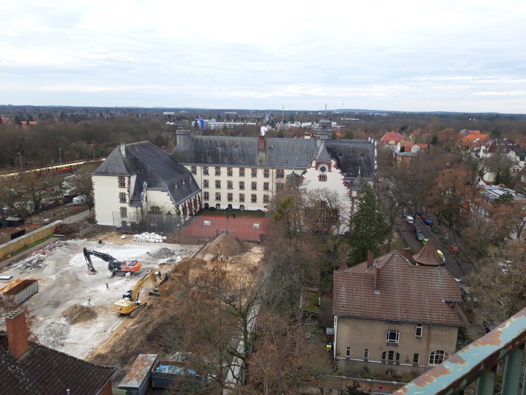 Einmal der Blick hin zu Haus B, der ehemaligen Beuckeschule. Als der Turm gebaut wurde, befand sich noch das Gymnasium Zehlendorf darin, und man sieht schnell, dass darauf geachtet wurde, dass das Haus A ein paar Meter höher wird. Links sehr ihr die traurigen Reste der alten Turnhalle.